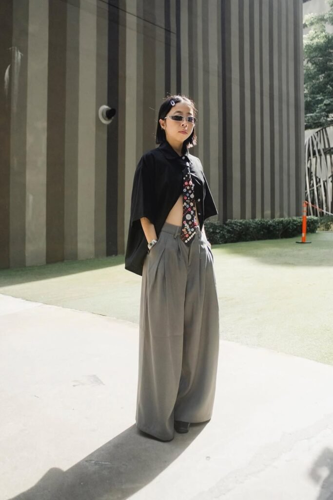 Use a vibrant tie to get an easy high-fashion street look. To keep everything in balance, wear a fun patterned tie with big pants and a cropped button-up shirt.