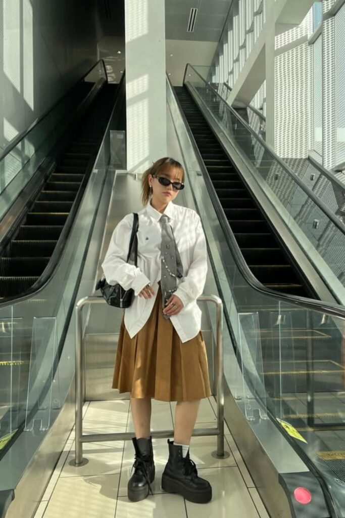 This look shows that a tie can be cool on the street. Wear a big white shirt with a pleated skirt and big boots. Then, for an attitude boost, add a gray tie with pins or chains.