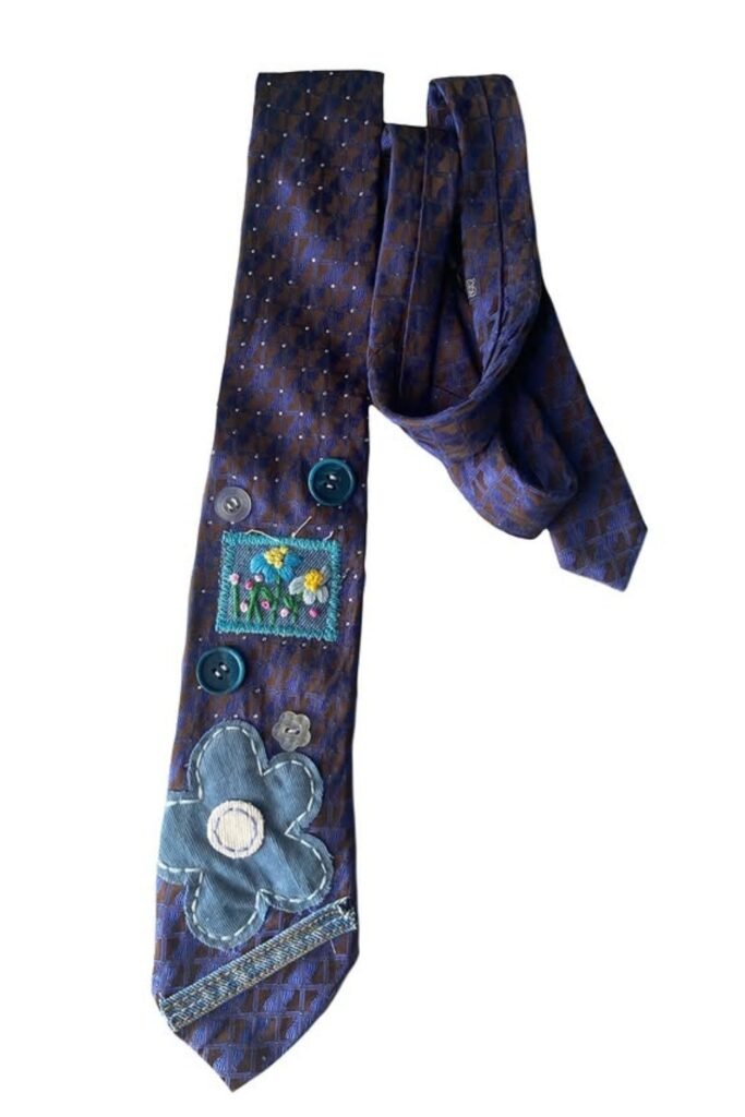 You can make an old tie into wearable art by adding fabric patches, beads, and textured appliqués.