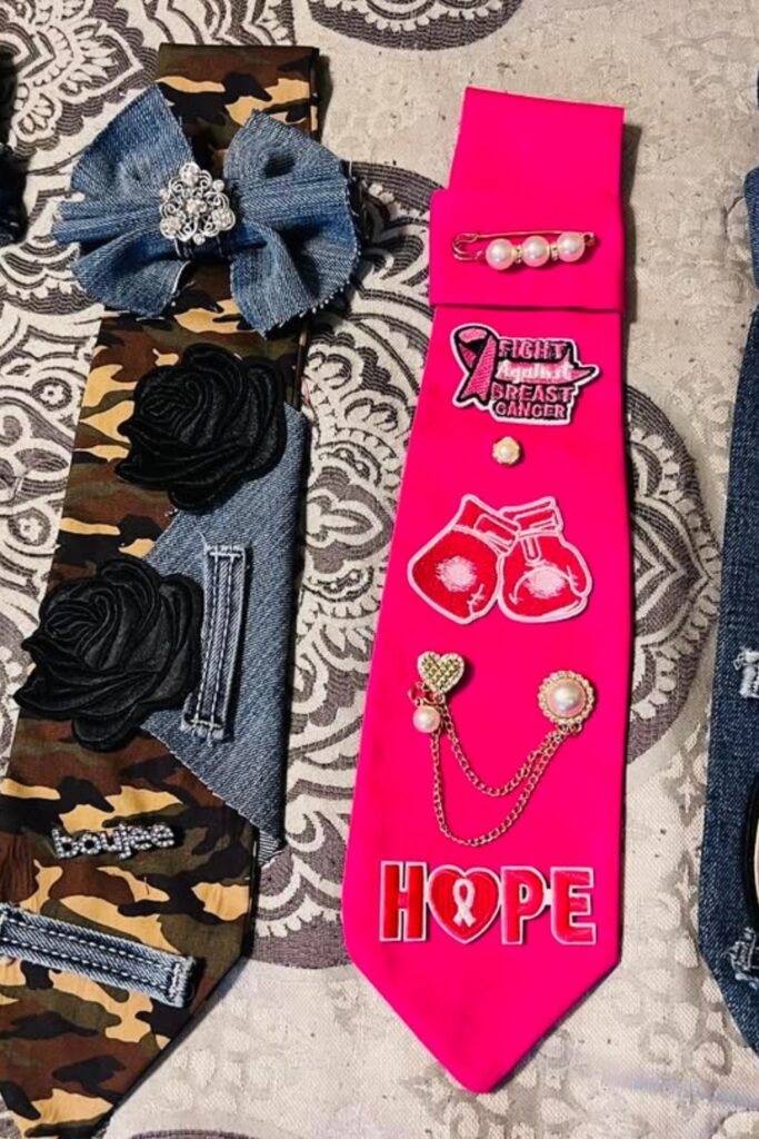 These innovative ties combine distinctive style with striking design. They all employ different fabrics, like denim, camo, or bright satin, and are embellished with appliqués, pearls, chains, or patches that have motivational themes like faith and hope.