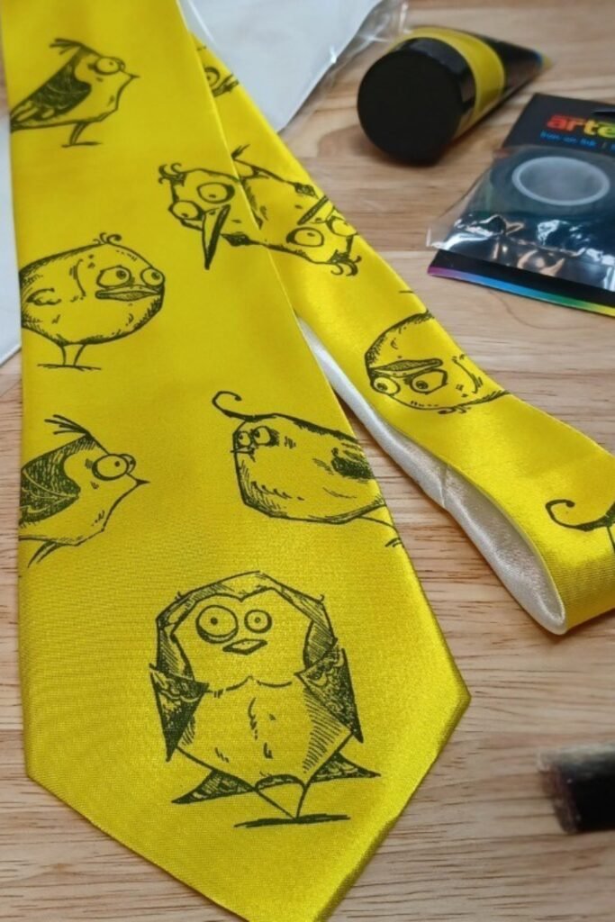 This yellow tie with hand-drawn birds on it is bright and full of character. It is manufactured with heat transfer ink, which gives it a professional look that will stay.
