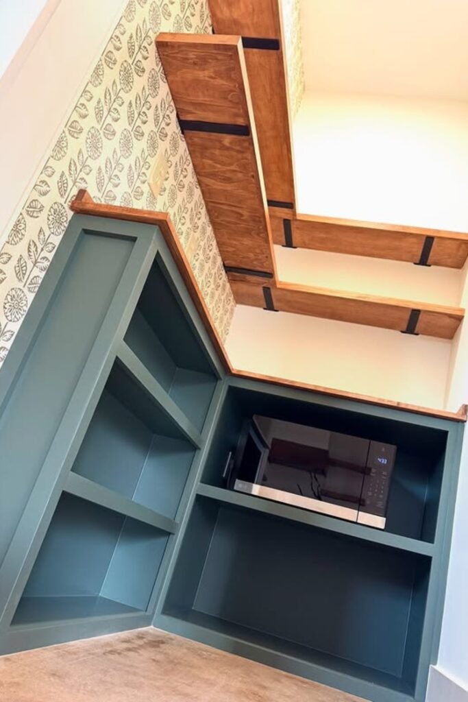 Built-in shelving with an appliance nook keeps microwaves off kitchens while still accessible during daily cooking routines.