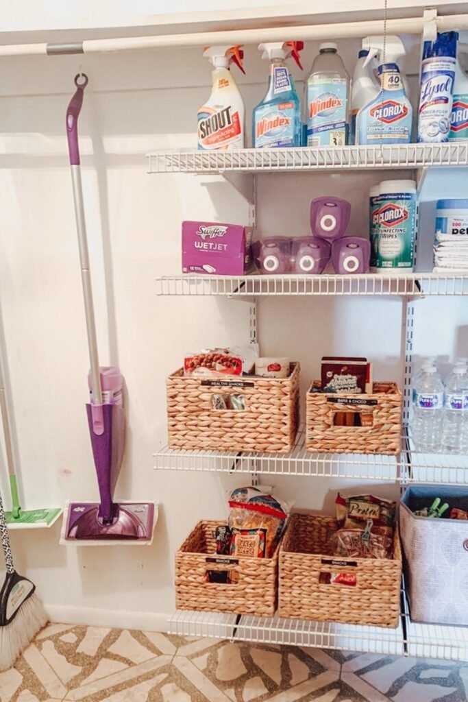 Pantry shelving can double as household storage when shelves adjust to hold cleaning supplies safely without spills happening.