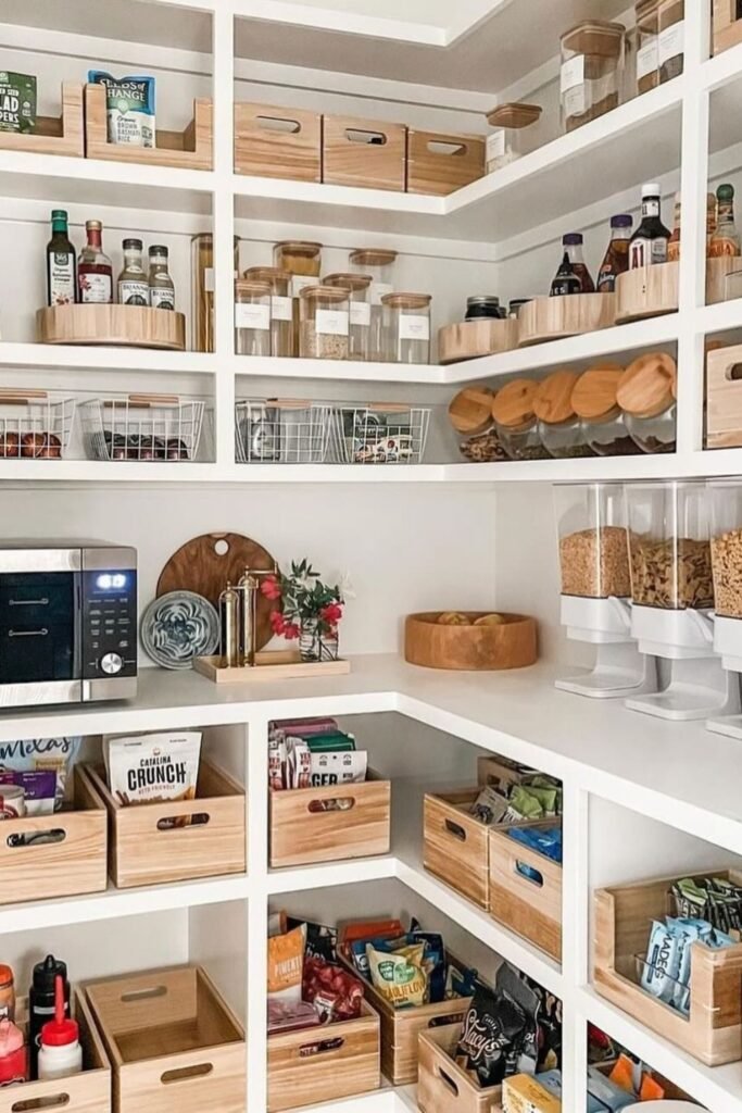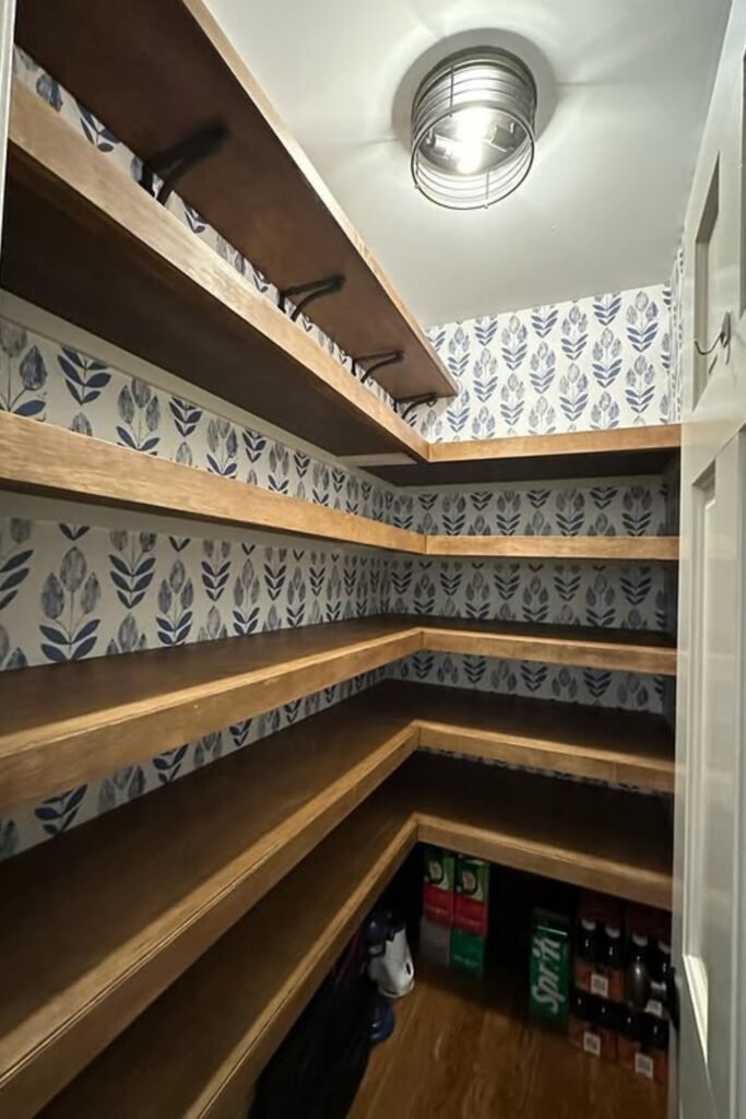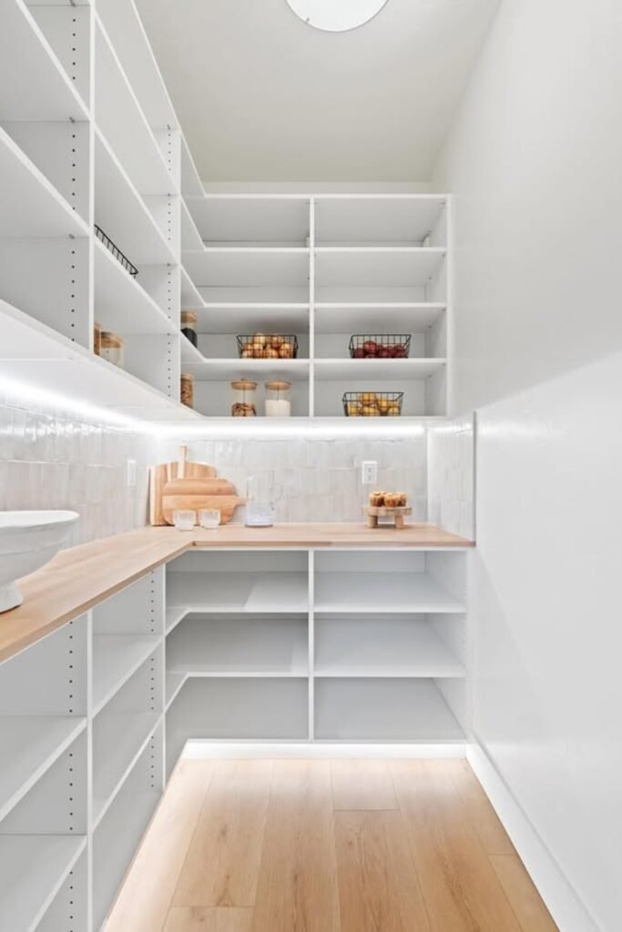 Wraparound wood shelves maximize wall coverage, making small pantry rooms feel organized instead of boxed in