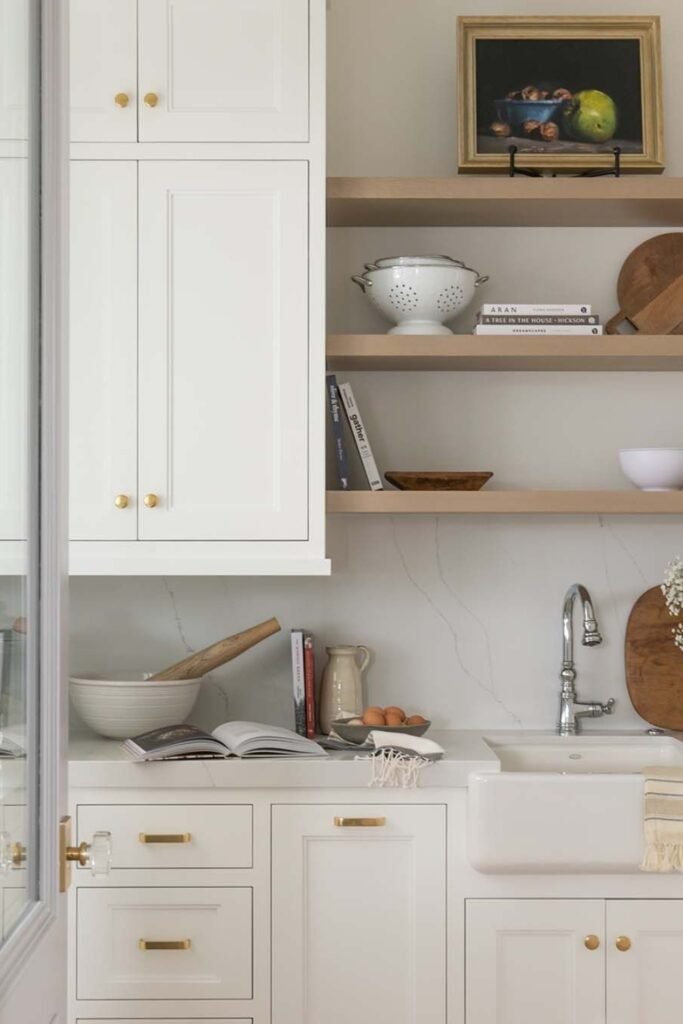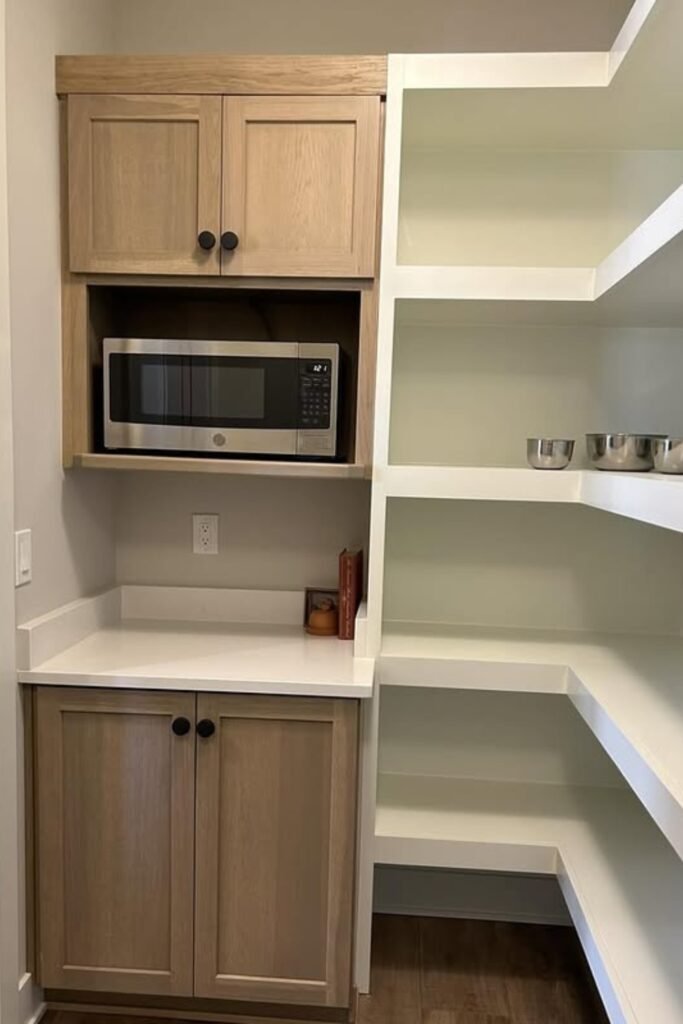 Built-in open shelves work best for walk-in or butler-style pantries where visibility matters more than hiding everything behind doors.
