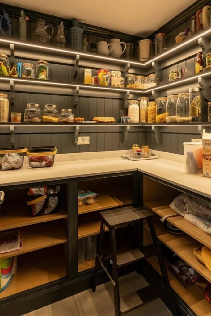 Dark shelving combined with integrated lighting improves visibility while giving pantries a more intentional, finished look.