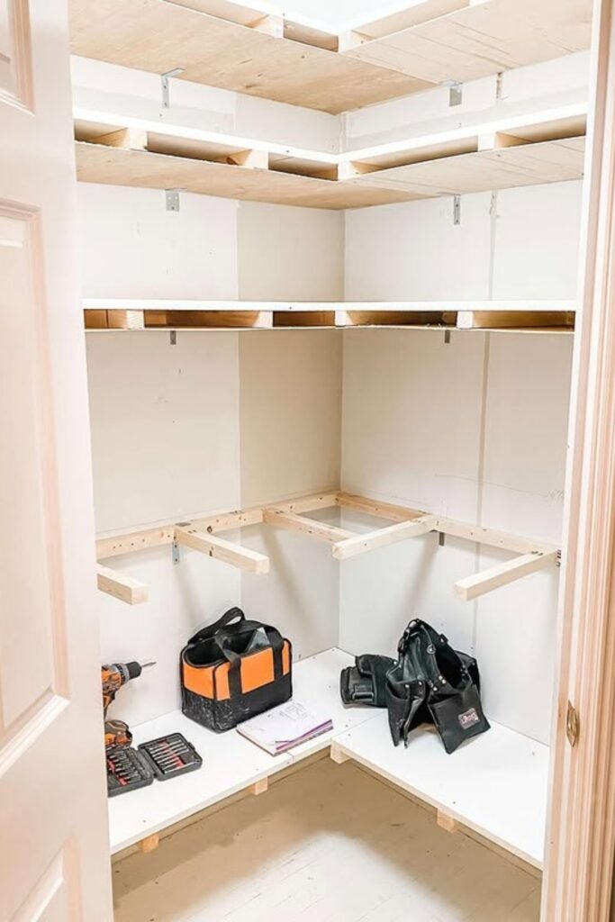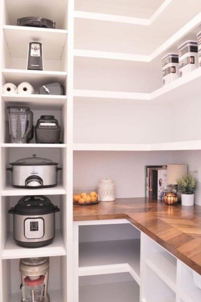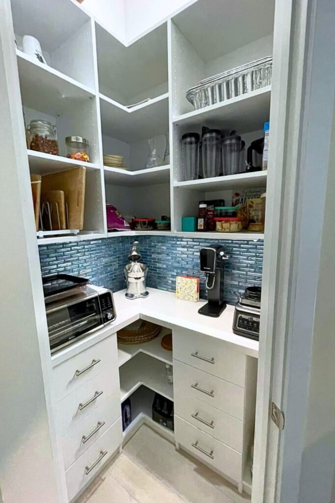 Corner pantry shelving paired with a small counter creates functional zones instead of awkward dead space.