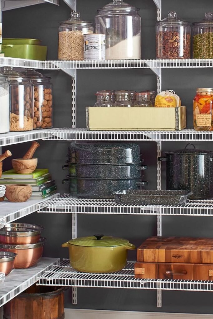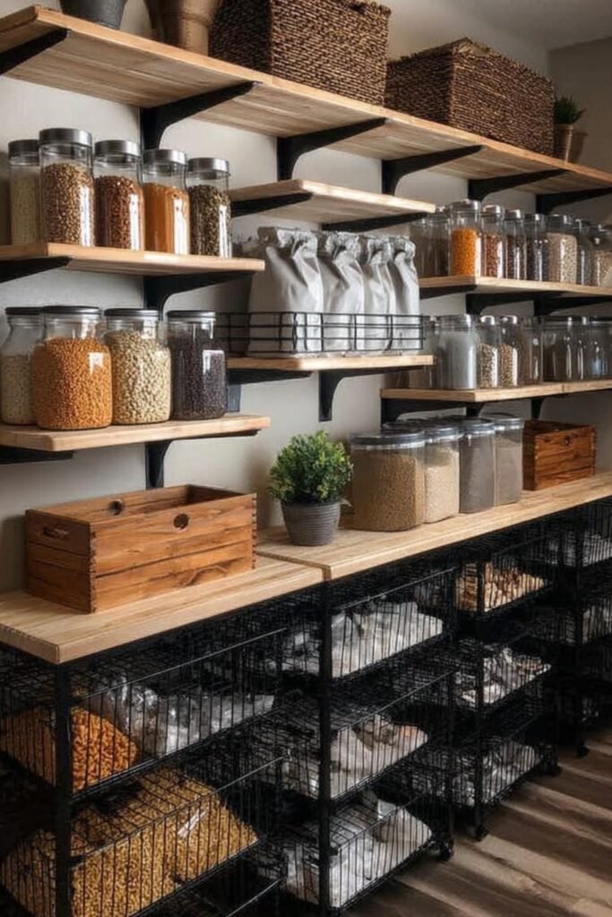 This setup balances storage and display, making pantry shelving feel intentional while still handling daily kitchen use easily.