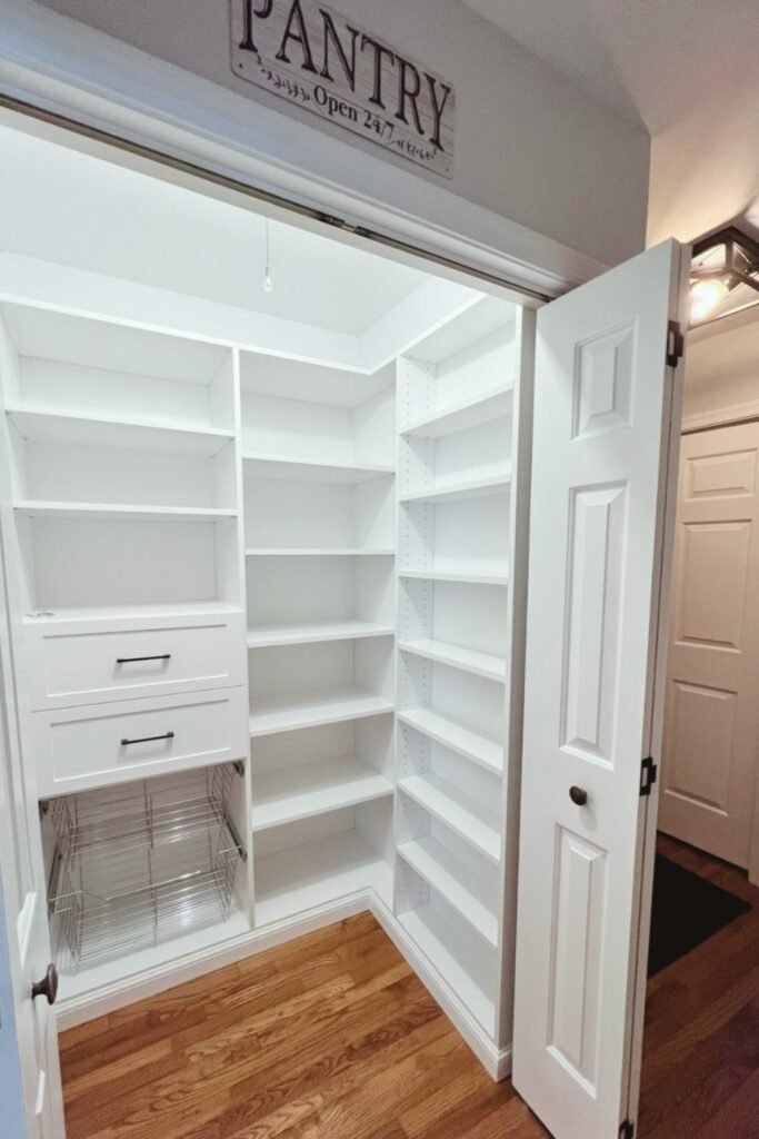 Shallow pantry shelves prevent food from hiding in the back, which is a common problem with standard deep shelving.