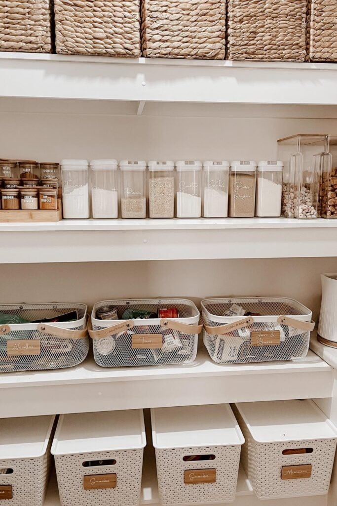Open shelving paired with baskets keeps pantry items grouped while avoiding the cluttered look loose packages create.