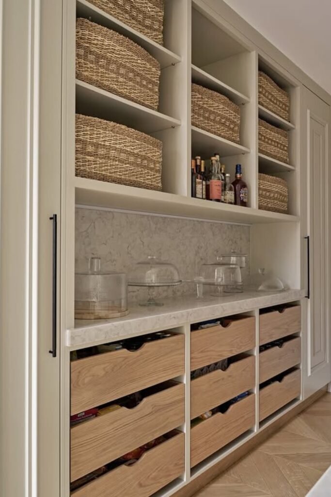 Lower pantry drawers prevent deep shelves from becoming black holes where snacks disappear behind forgotten packages and cans.