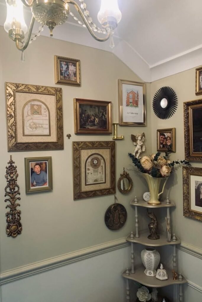 Corners feel intentional when ornate frames wrap both walls, turning an awkward angle into a collected, story-driven display.