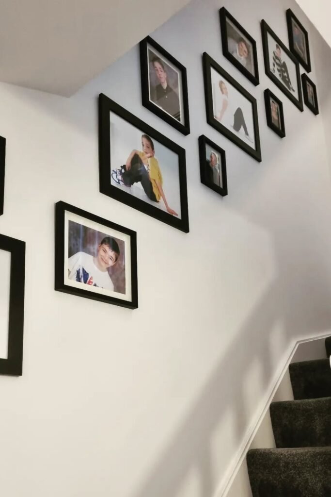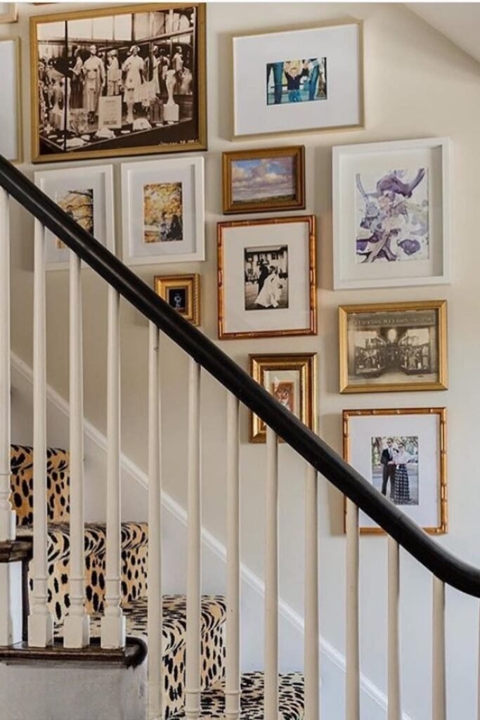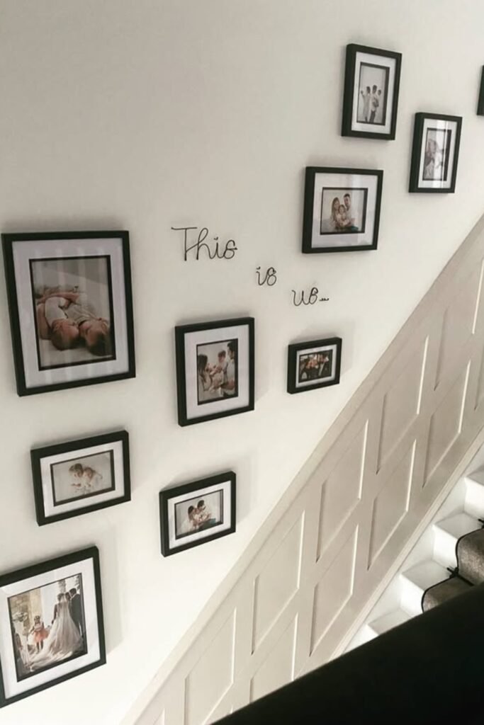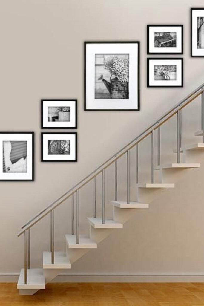 Start near the handrail with larger photos, then gradually reduce sizes as the wall rises naturally.