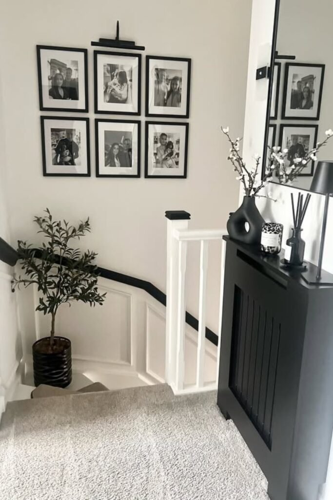 Small landings feel styled when frames stay tightly grouped rather than spreading across walls.