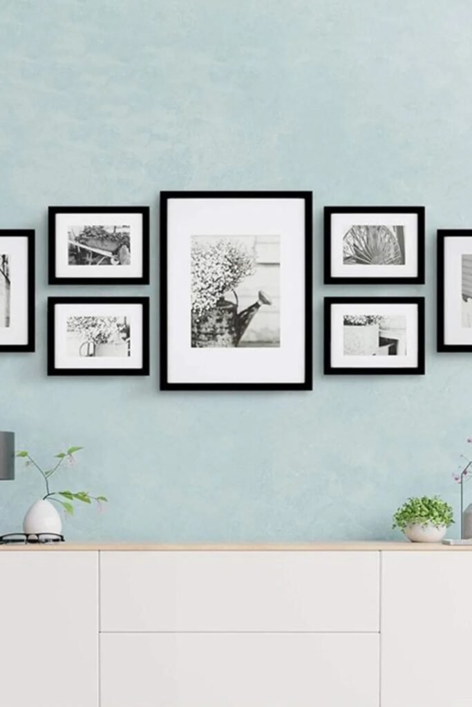 Hang the central frame first at eye level, then space surrounding pieces evenly using painter’s tape guides.