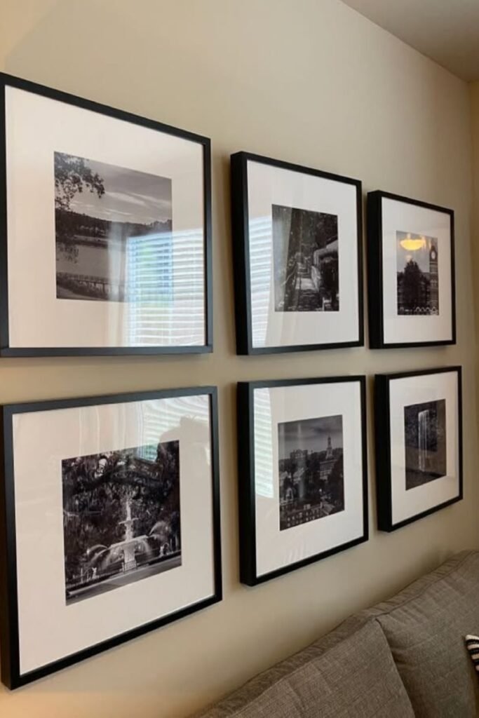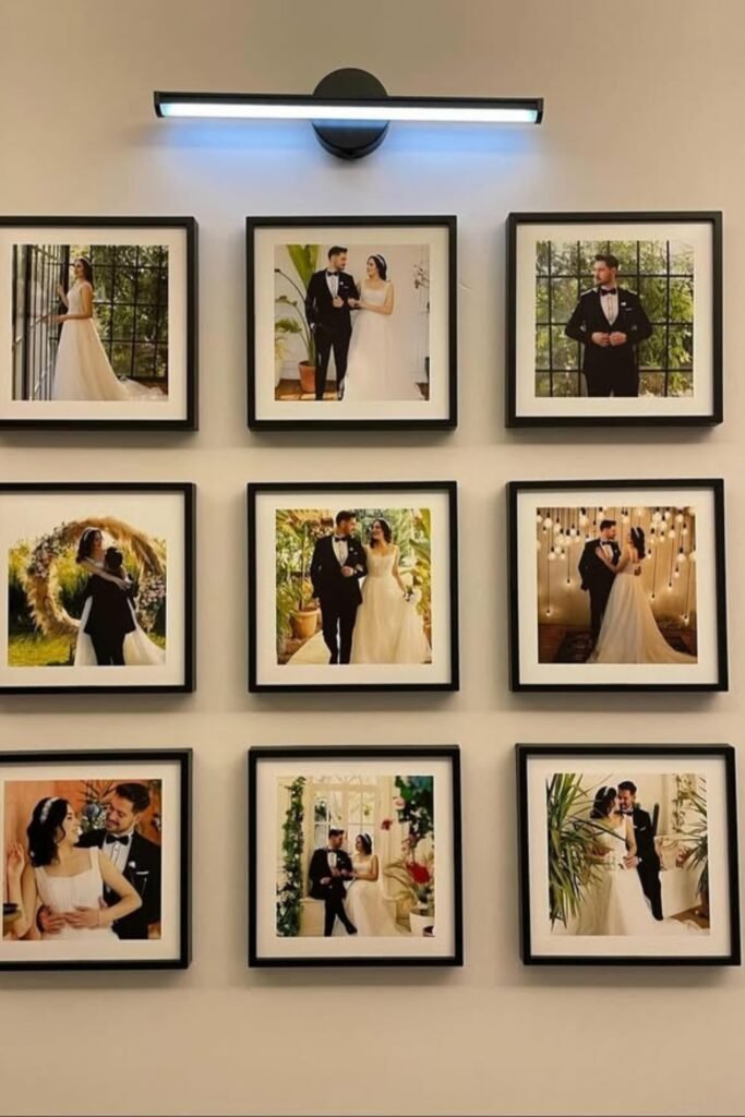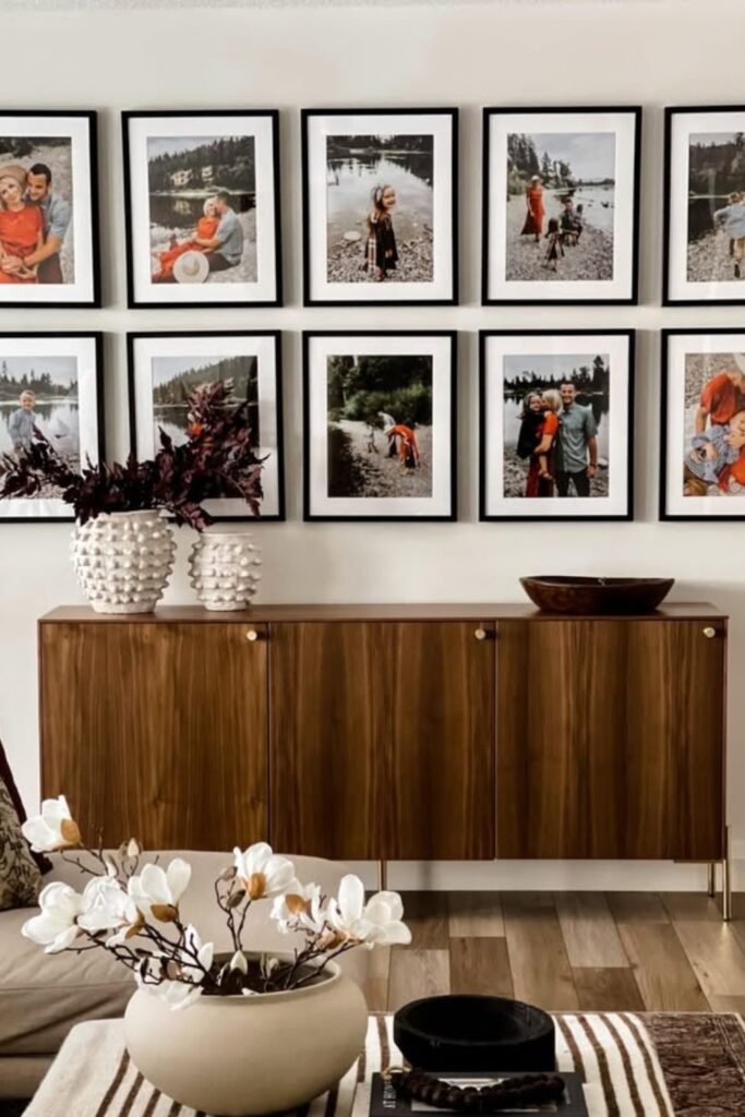Combining varied photo orientations inside identical frames keeps the wall structured while allowing emotional variety