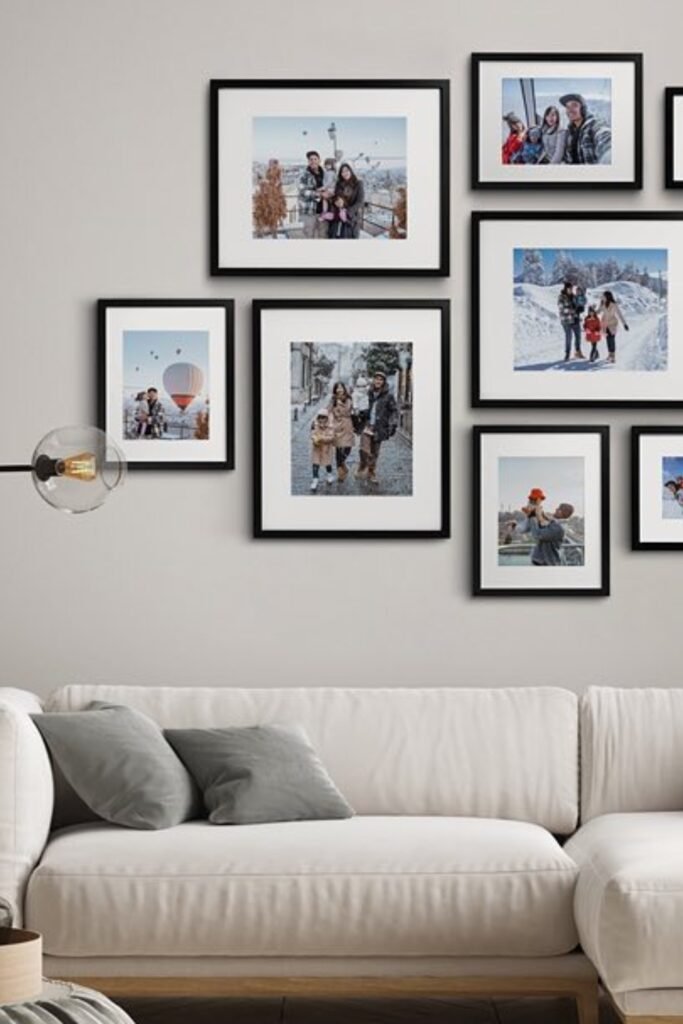 A photo wall collage can be made with framed prints, unframed photos, posters, or even mixed media, depending on your space and budget.