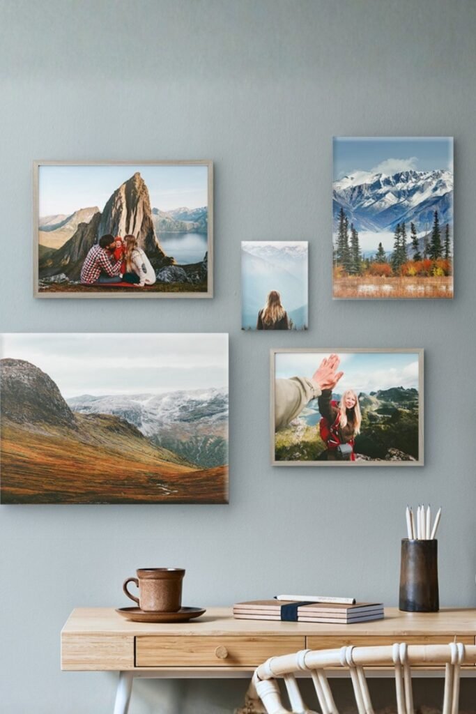 Start by anchoring one large landscape photo, then build outward using medium prints while keeping two-inch spacing consistent.