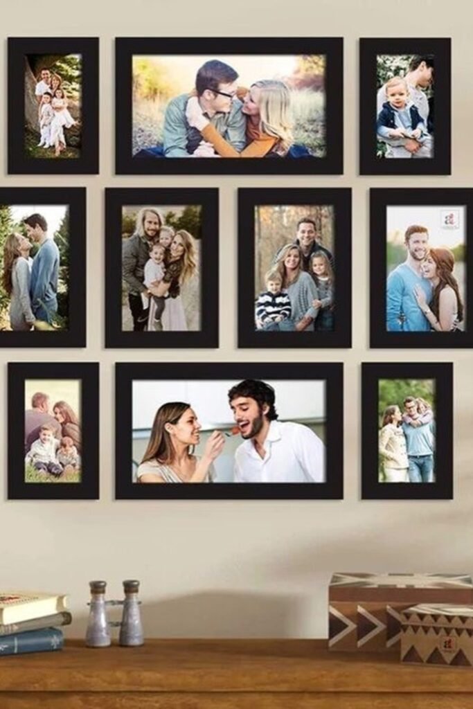 Mix frame sizes freely, keeping visual balance by distributing colors and faces evenly across the cluster.