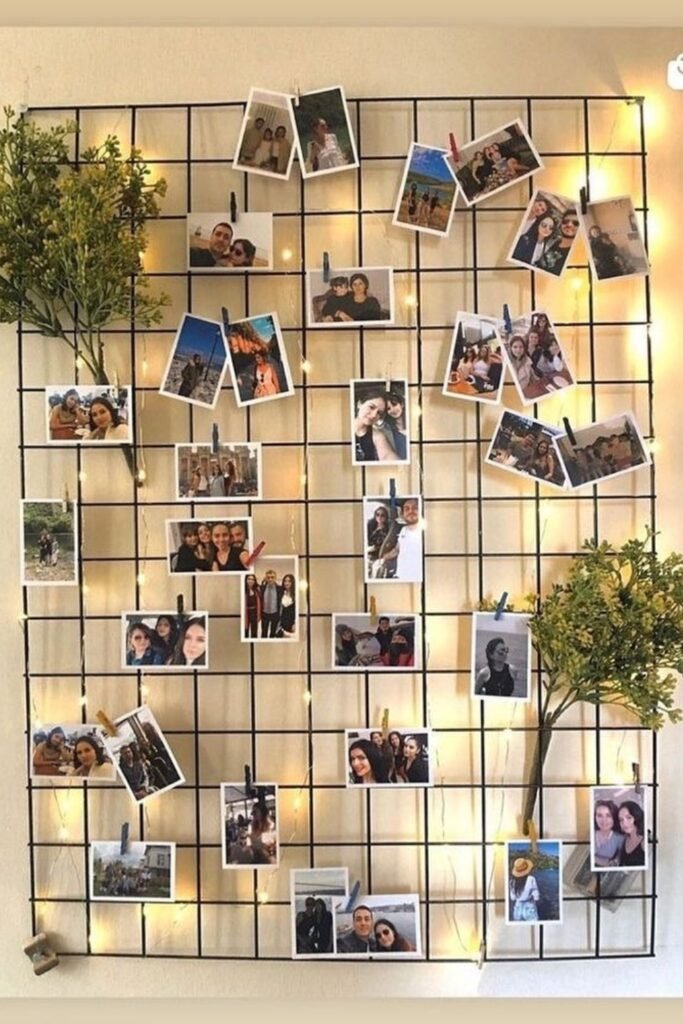 Attach the grid using anchors or removable hooks, then clip photos loosely to allow easy swapping anytime.