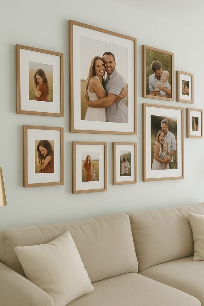 This DIY layout suits sofa walls where balance matters and emotional focus should land immediately.