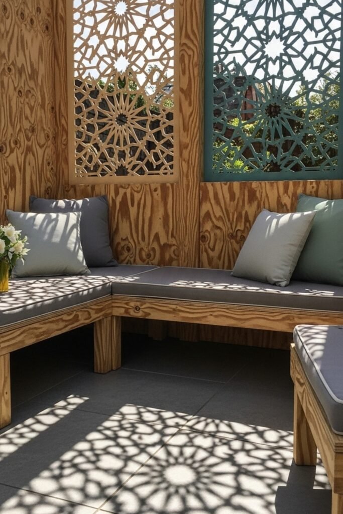 This idea works well for patios and garden seating areas. Seal and paint the plywood to protect it from moisture and create a finished, decorative look.
