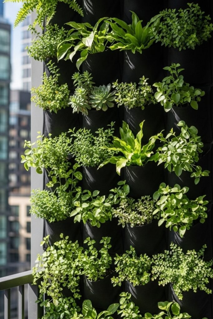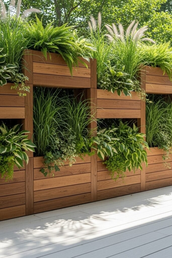 A vertical garden screen creates privacy while adding greenery. Mount planters or plant pockets onto a sturdy frame.
