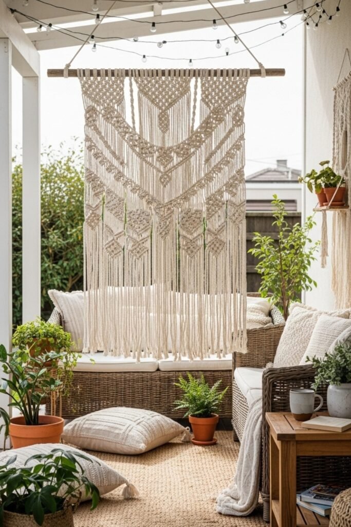 A macramé privacy screen adds a soft, decorative layer rather than full coverage. Hang large macramé panels from a rod or beam.