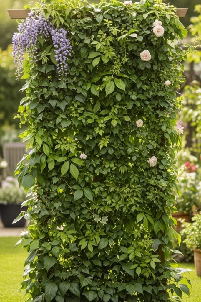 This works well for gardens and patios. Over time, the plants form a dense green wall that blocks views while keeping the space cool.