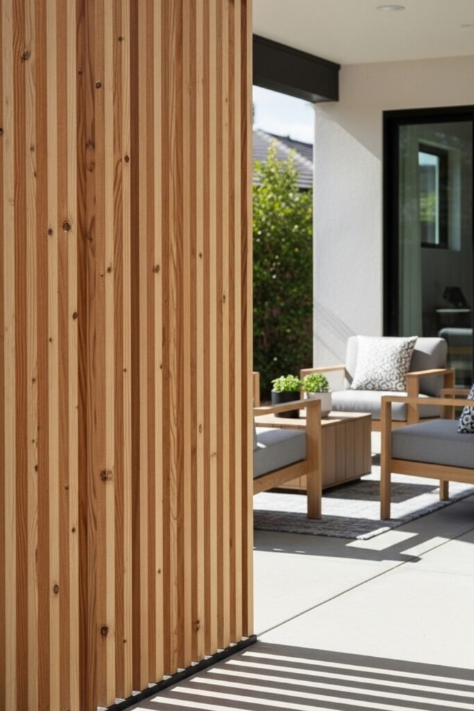 A wood slat privacy screen gives you coverage without making the space feel closed in. Space the slats evenly so air and light still pass through.