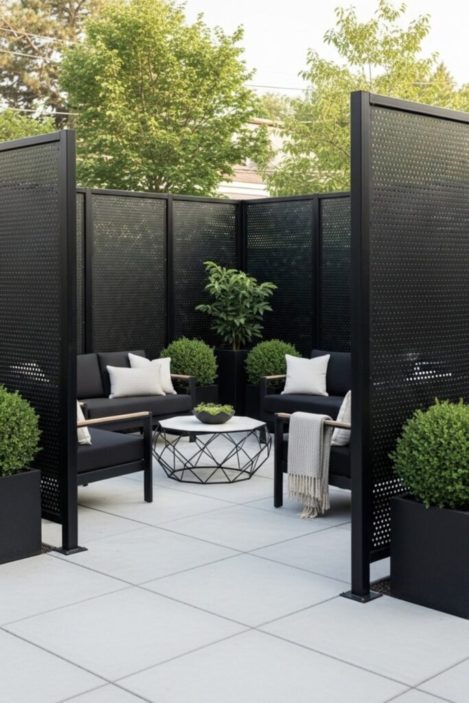 Metal panel screens give a bold and modern look while providing solid privacy. Use corrugated sheets or perforated metal attached to a frame.