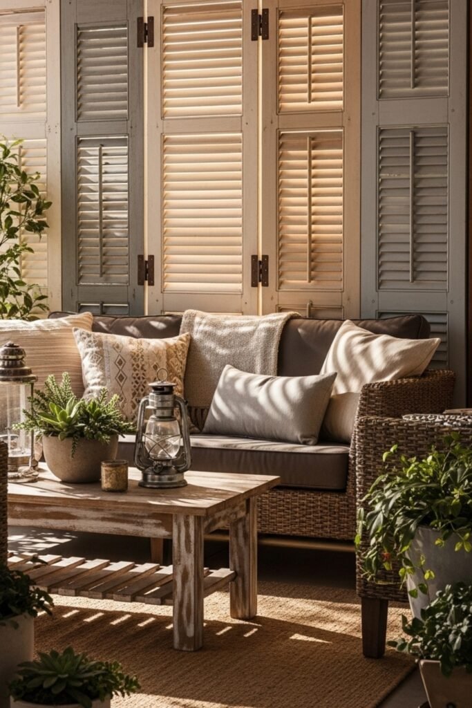 Old shutters can be turned into a stylish privacy screen with minimal effort. Connect multiple shutters using hinges or a frame so they stand upright.