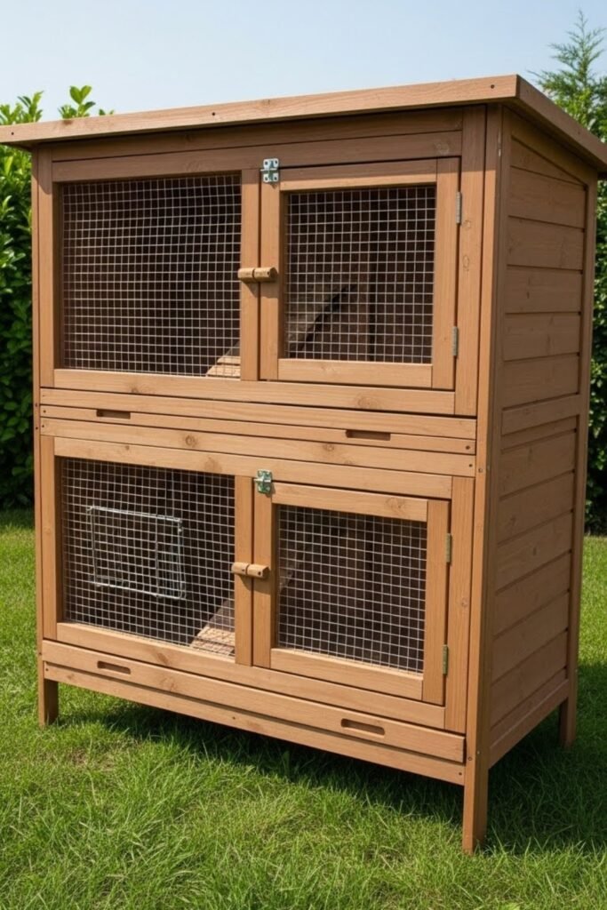 This design works well for tight areas and provides a secure, enclosed feel for rabbits. Proper ventilation panels should be added to prevent stagnant air.