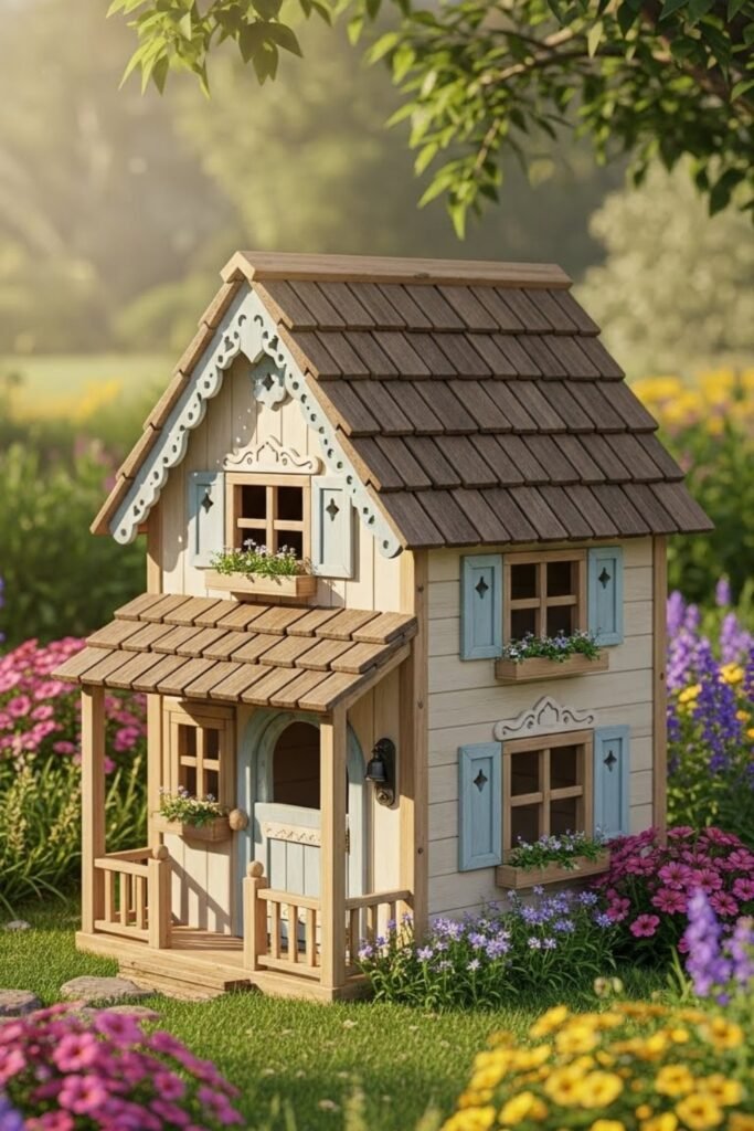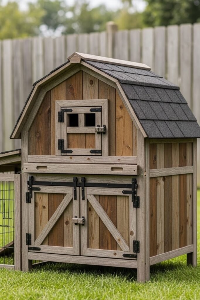 A playhouse hutch looks like a tiny house, adding charm to your backyard. It usually includes a pitched roof, windows, and decorative trim.