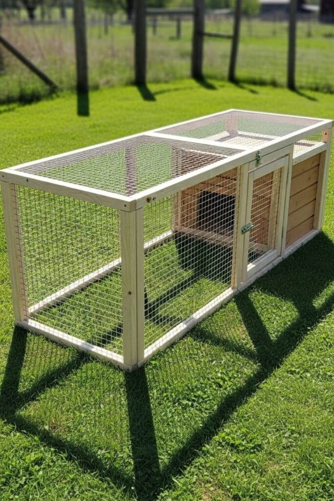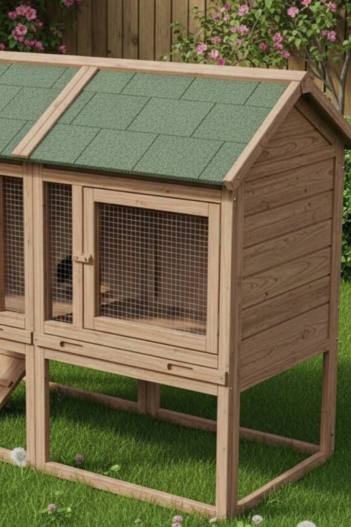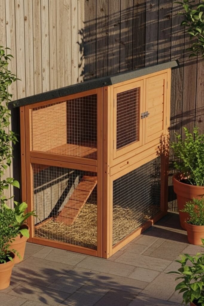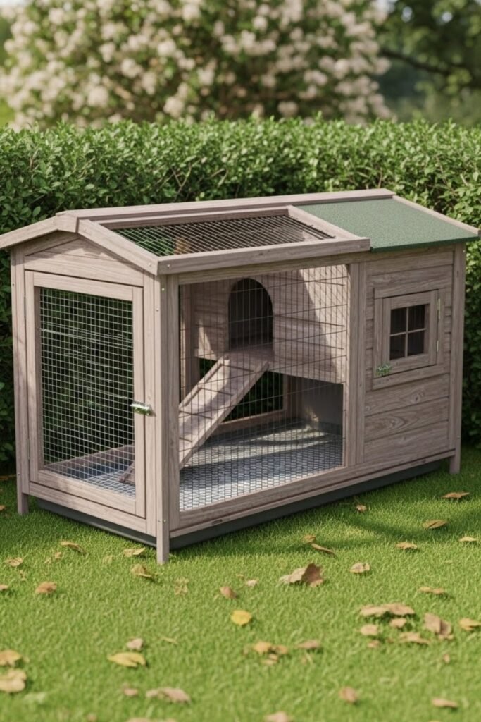 The sloped sides reduce water pooling, while the compact footprint saves yard space. Add mesh panels on one side for ventilation and sunlight without overheating the rabbits.