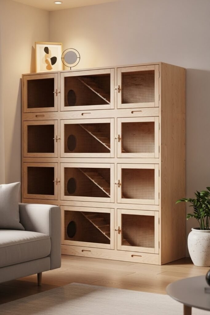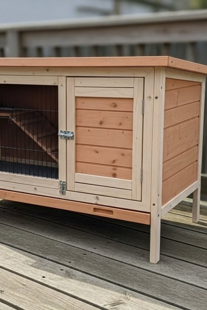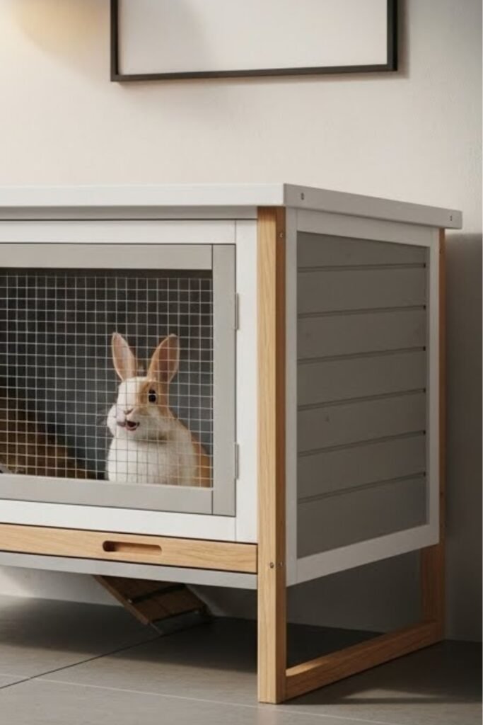 An indoor hutch works well for homes where rabbits live inside year-round. It focuses on clean lines, easy access, and odor control.