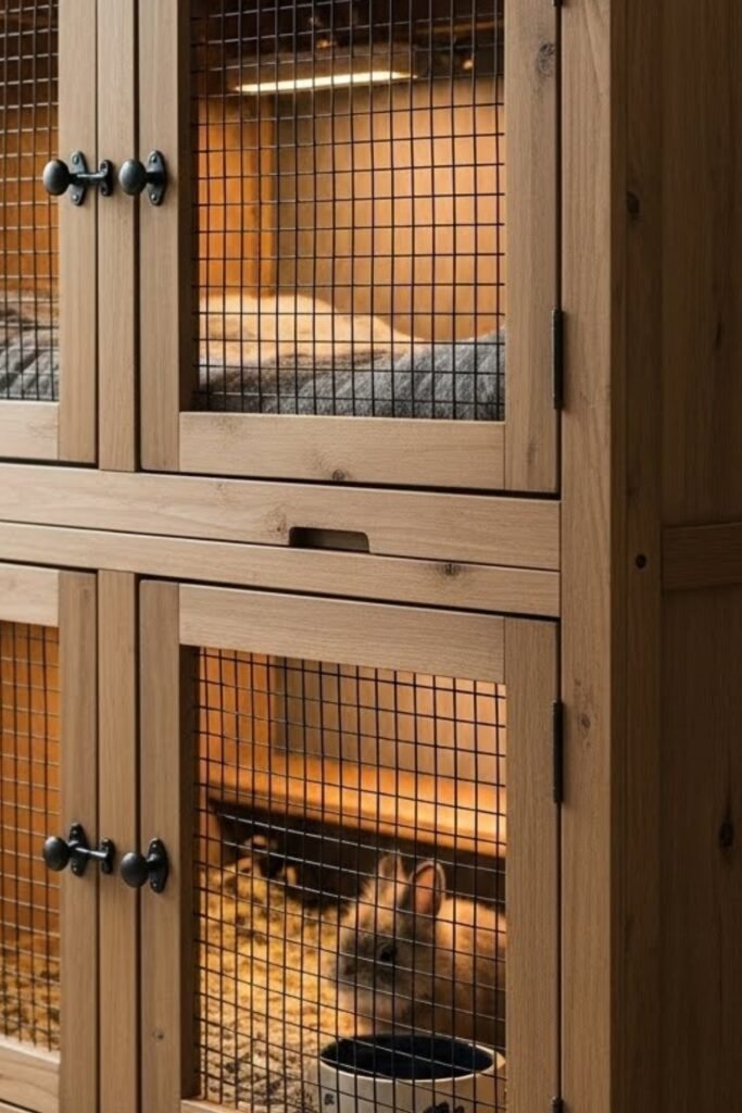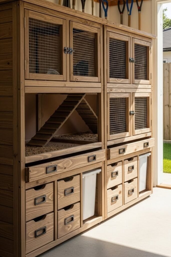 A storage hutch combines rabbit housing with built-in compartments for feed, bedding, and supplies. Cabinets or drawers are placed below or beside the living area.