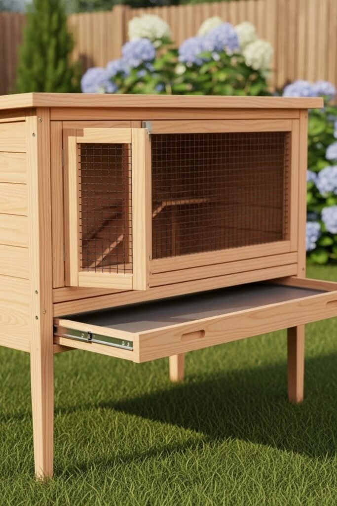 Many DIY versions include a pull-out tray for waste. This style works great in backyards and can be paired with a small ramp leading to a run.