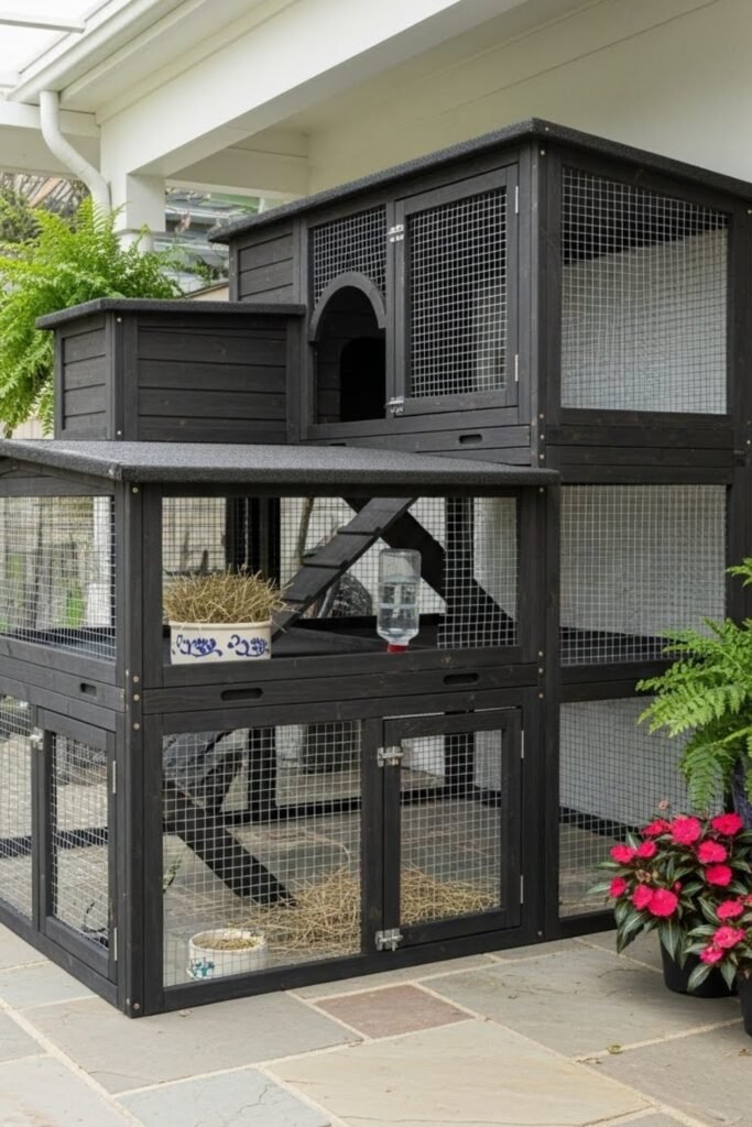 This design is helpful for separating feeding and sleeping zones. It’s also useful for bonded rabbits that still need defined personal areas.