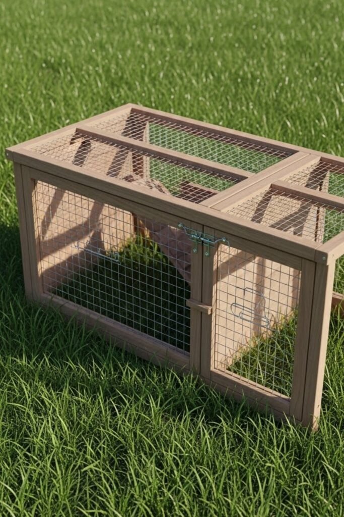 A tractor hutch is designed to move across grass, allowing rabbits to graze safely. It usually has a lightweight frame with an open bottom and mesh sides.