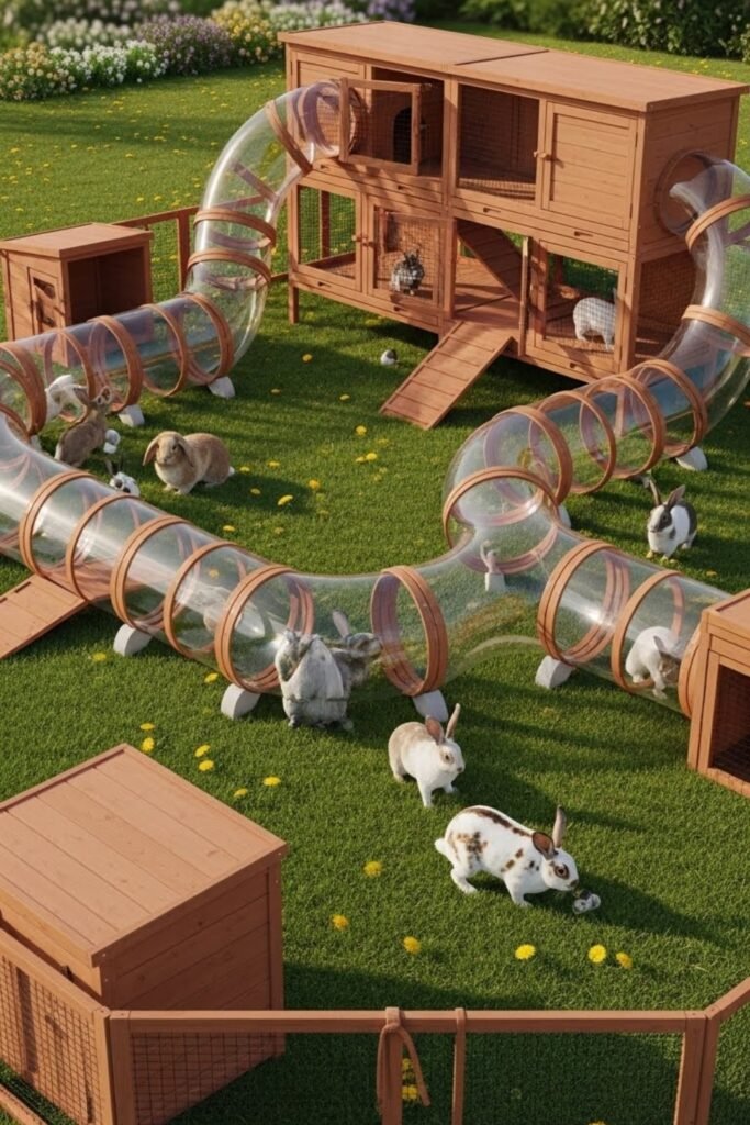 A tunnel hutch connects multiple sections using enclosed tunnels. Rabbits can move freely between sleeping, feeding, and play areas.