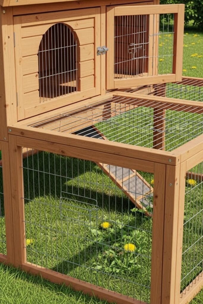A convertible hutch can open into a run or close into a compact enclosure. Hinged panels or removable sections allow flexible use depending on weather or space.