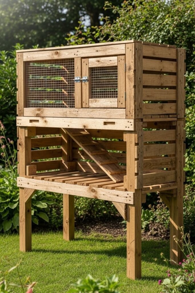 A pallet hutch is perfect for a low-cost DIY build using reclaimed wood. The open slats allow airflow while still keeping rabbits secure.