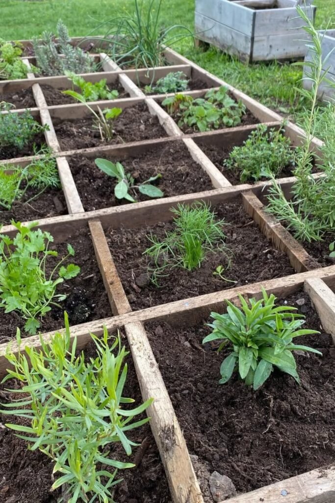A grid layout keeps every herb separated, giving each plant enough space to grow strongly without competing for soil or light.