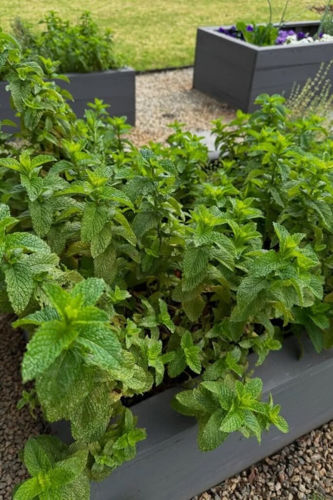A deep planter keeps mint controlled, stopping roots from spreading into other beds while giving the plant plenty of growing room.