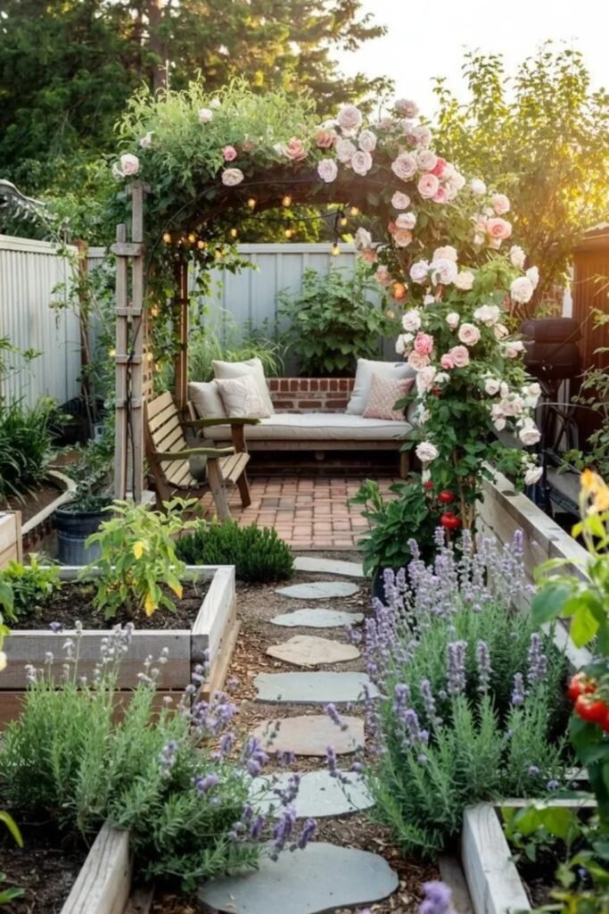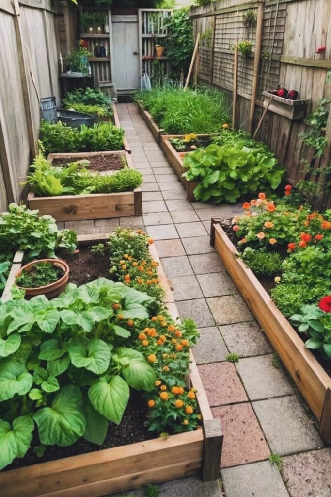 Use this layout in sunny garden corners where mixed planting helps reduce pests and keeps harvests steady through the season.
