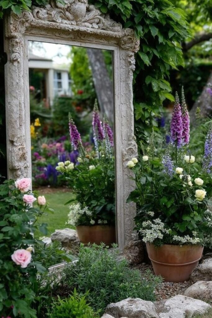 A tall outdoor mirror instantly doubles the look of your greenery, making small herb areas feel wider without changing layout.