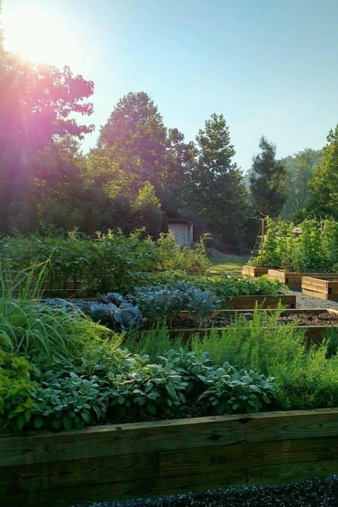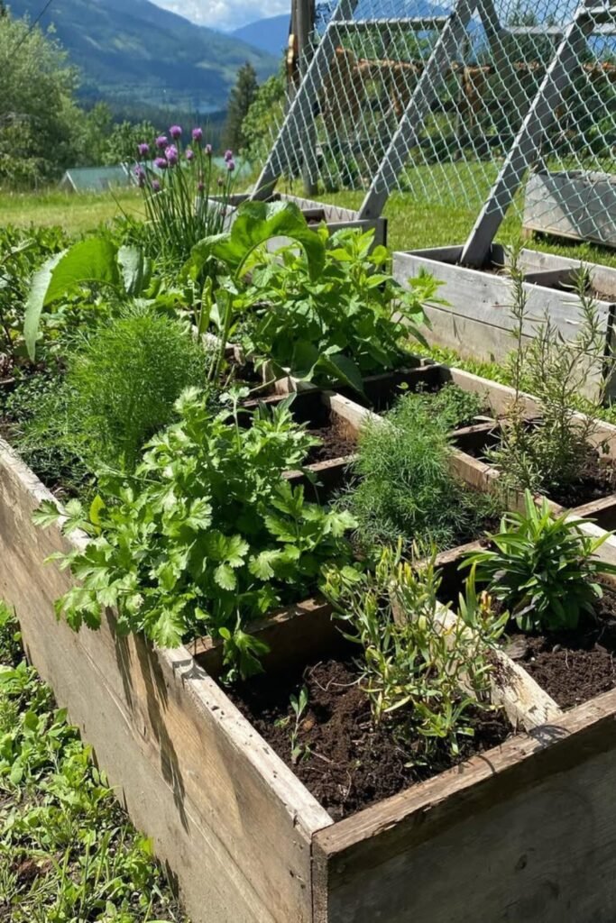 Wide wooden beds catch early sunlight, giving herbs the strong morning energy they need for fuller growth and healthy flavor.