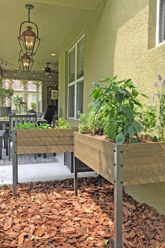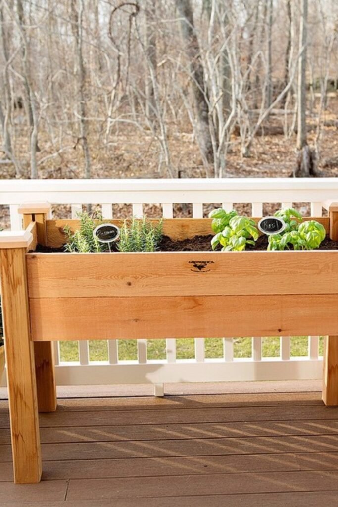 A raised porch planter lifts herbs closer to eye level, making watering easier while keeping leaves safe from ground pests.