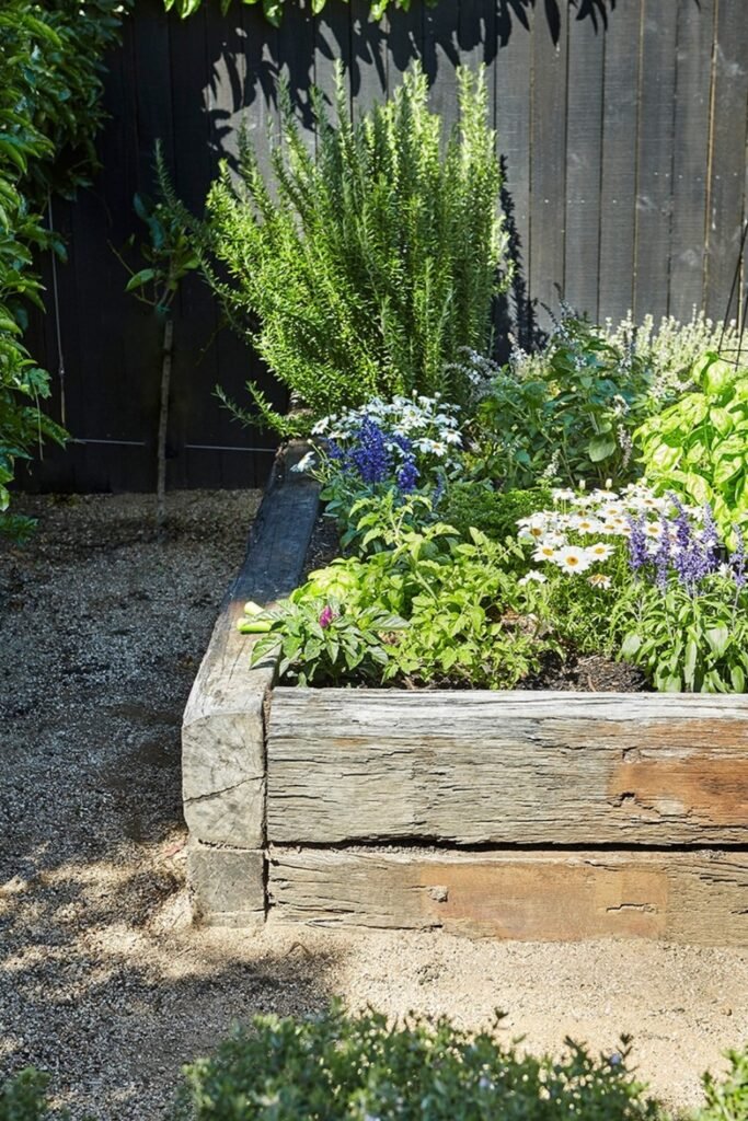 Old timber beams create a strong, rustic raised bed that keeps herbs grounded while adding natural texture to quiet corners.